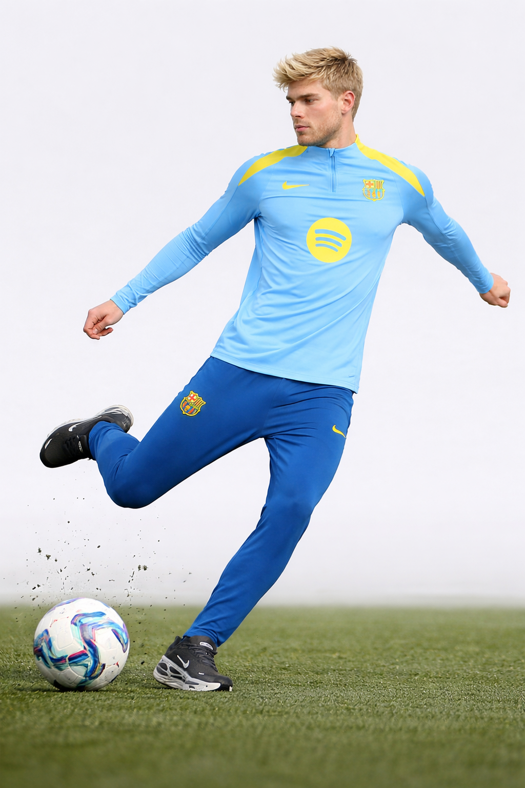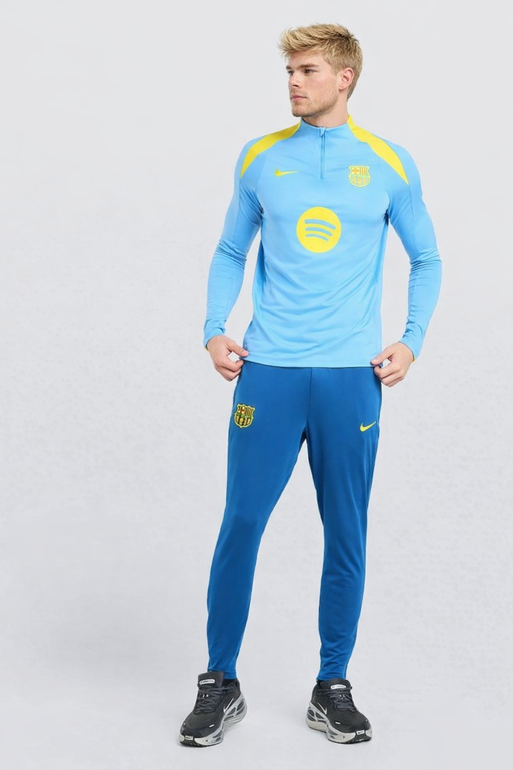 Dit is het nieuwe Nike FC Barcelona Strike Trainingspak 1/4-Zip 2025-2026 Lichtblauw Donkerblauw Felgeel. De kenmerkende teamdetails, zoals het clublogo en de Nike swoosh, geven de klasse en de waarden van de club weer. Toon nu je passie voor de Spaanse club met dit gave FC Barcelona trainingspak!